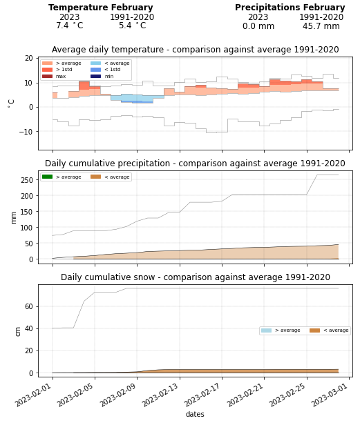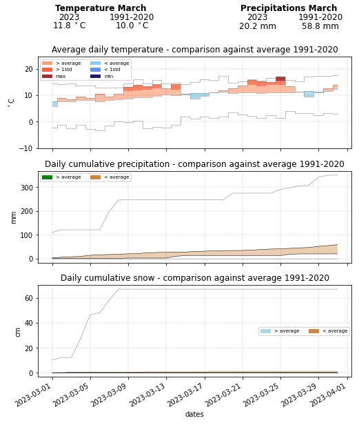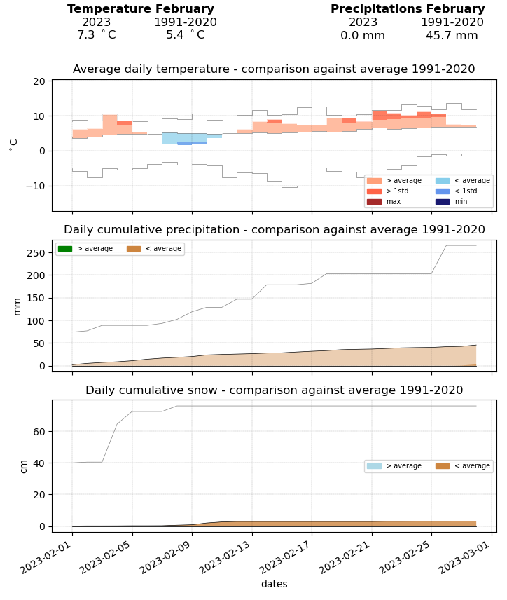 Daily data and comparison against the daily climatological average 1991-2020. Top panel: daily mean temperature (Tmin+Tmax)/2. Central panel: cumulative precipitation. Lower panel: cumulative snow amount. The grey thin lines represent the extremes computed on the full timeseries since 1882.